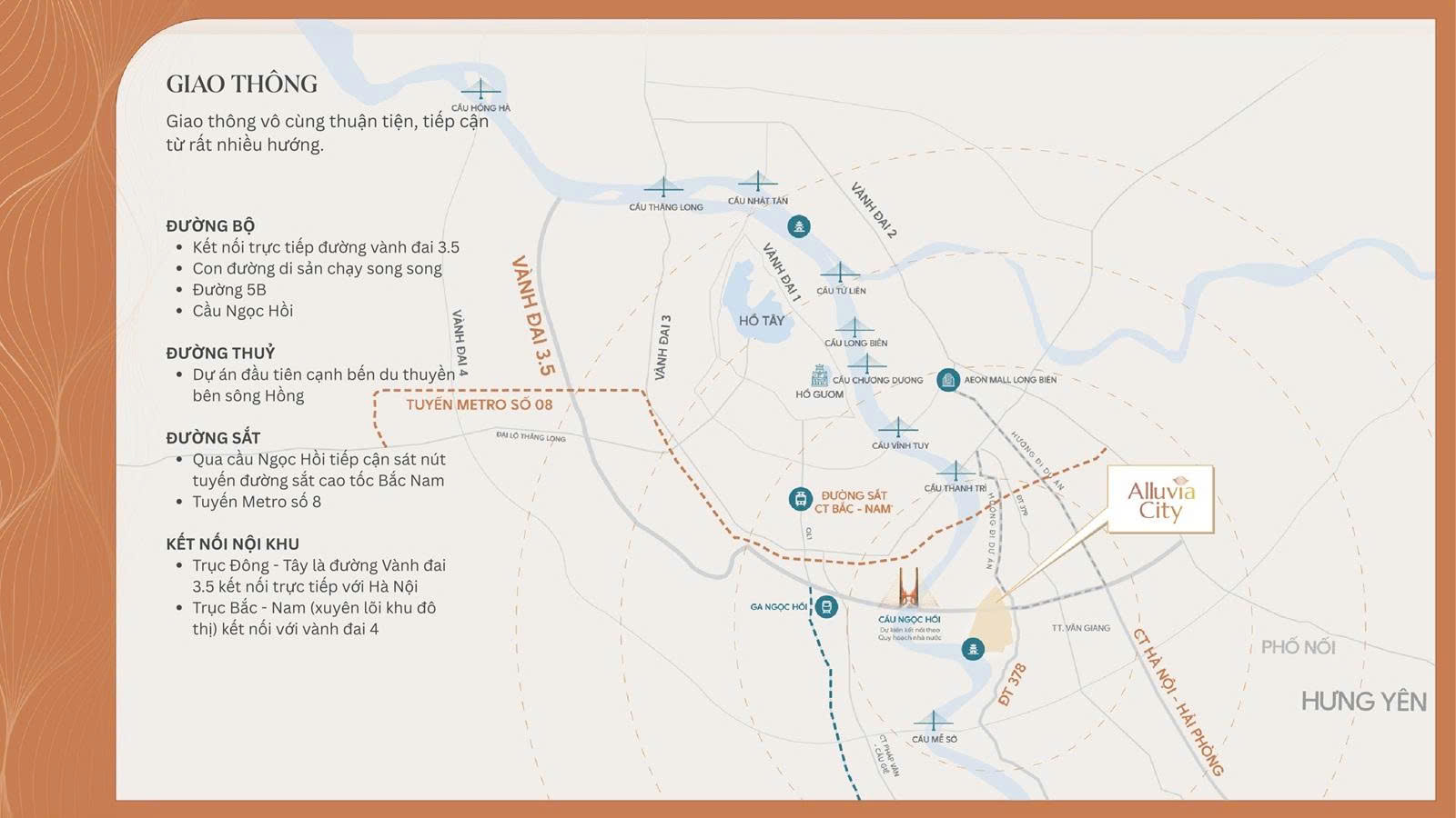 Vị trí chung cư Alumi nổi bật ngay trung tâm phân khu Alluvia Onsen, liền kề Đường Di Sản và Vành đai 3.5, mang đến khả năng kết nối thuận tiện tới trung tâm Hà Nội và các đô thị vệ tinh. Từ Alumi, cư dân chỉ mất vài phút để di chuyển đến Cầu Ngọc Hồi, giúp rút ngắn thời gian đi lại hàng ngày.